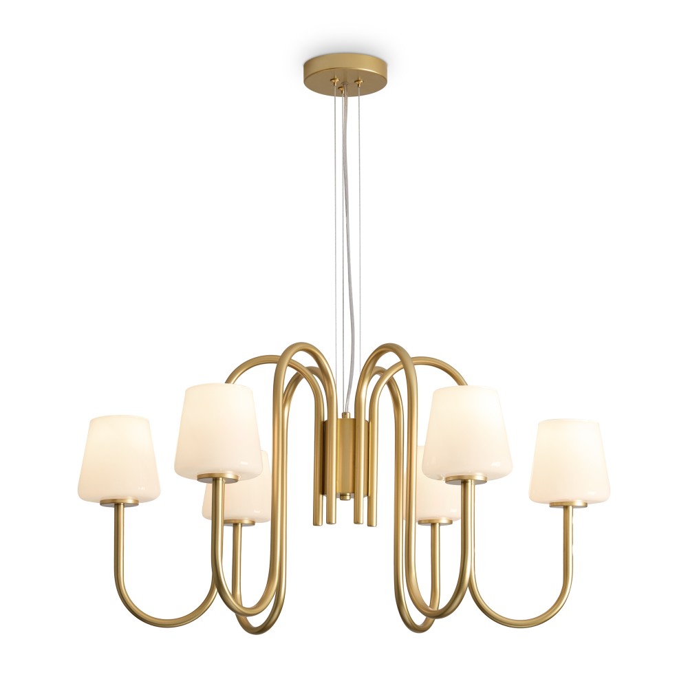 Материал арматуры — металл, цвет — матовое золото. Подвесной и настенный светильники с цоколем E14. Плафоны выполнены из белого глянцевого стекла, которые мягко рассеивают свет. Минималистичная классика подходит для современных и традиционных интерьеров.