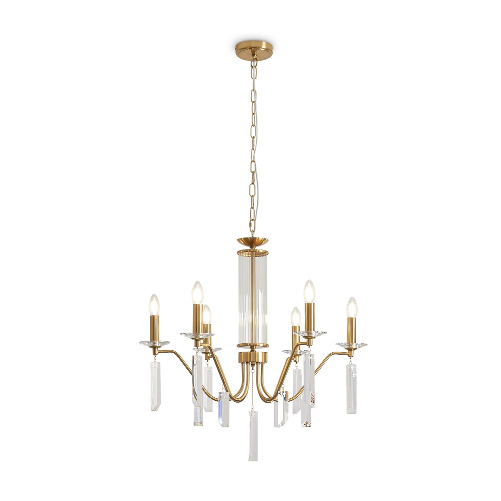 Материал арматуры — металл, цвет — никель или латунь. Подвесные светильники с цоколем E14. Доступны с пятью или шестью источниками света. Грани хрустальных подвесов создают эффект перелива радуги. Центральный декор из стеклянных трубок. Подходит для классических интерьеров.